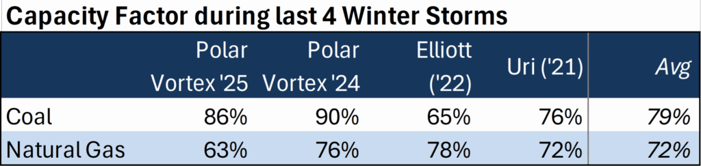 The central question for the Texas grid this weekend is whether the fossil fuel fleet can deliver. While ERCOT has roughly 55 GW of natural gas and 13.5 GW of coal capacity on paper, historical performance during extreme freezes tells a different story. Frozen equipment, fuel delivery issues, and iced coal stockpiles have historically sidelined some portions of natural gas and coal-fired power plants. As a result, only a portion of the currently installed natural gas and coal capacity can be counted on to be available during the upcoming storm. On average, about 79% of coal capacity and 72% of natural gas capacity were available and generated electricity during the last four major winter storms impacting the Texas power grid.