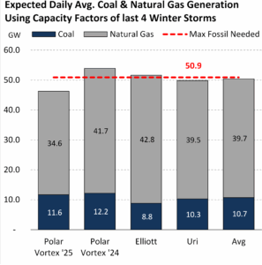 If we apply these historical capacity factors to the current fleet, the margin for error disappears. Our analysis shows that if the thermal fleet performs at levels seen during the 2025 Polar Vortex or Winter Storm Uri (2021), the grid will likely face a generation shortfall to meet the expected maximum fossil-fuel generation need on January 25th.