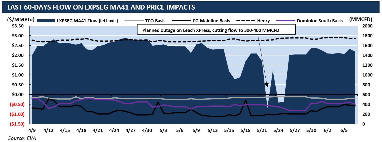 Over the last 60 days, flow volumes via LXPSEG MA41 have averaged above 1.4 BCFD (chart below). In late May, planned maintenance on the Lone Oak and Leach Xpress segments cut flow to 300-400 MMCFD, which put downward pressure on producing hubs like Dominion South as Northeast gas lost an essential outlet through Leach Xpress. On the other hand, this planned maintenance provided a small uplift to downstream hubs such as TCO Pool due to the reduced supply.